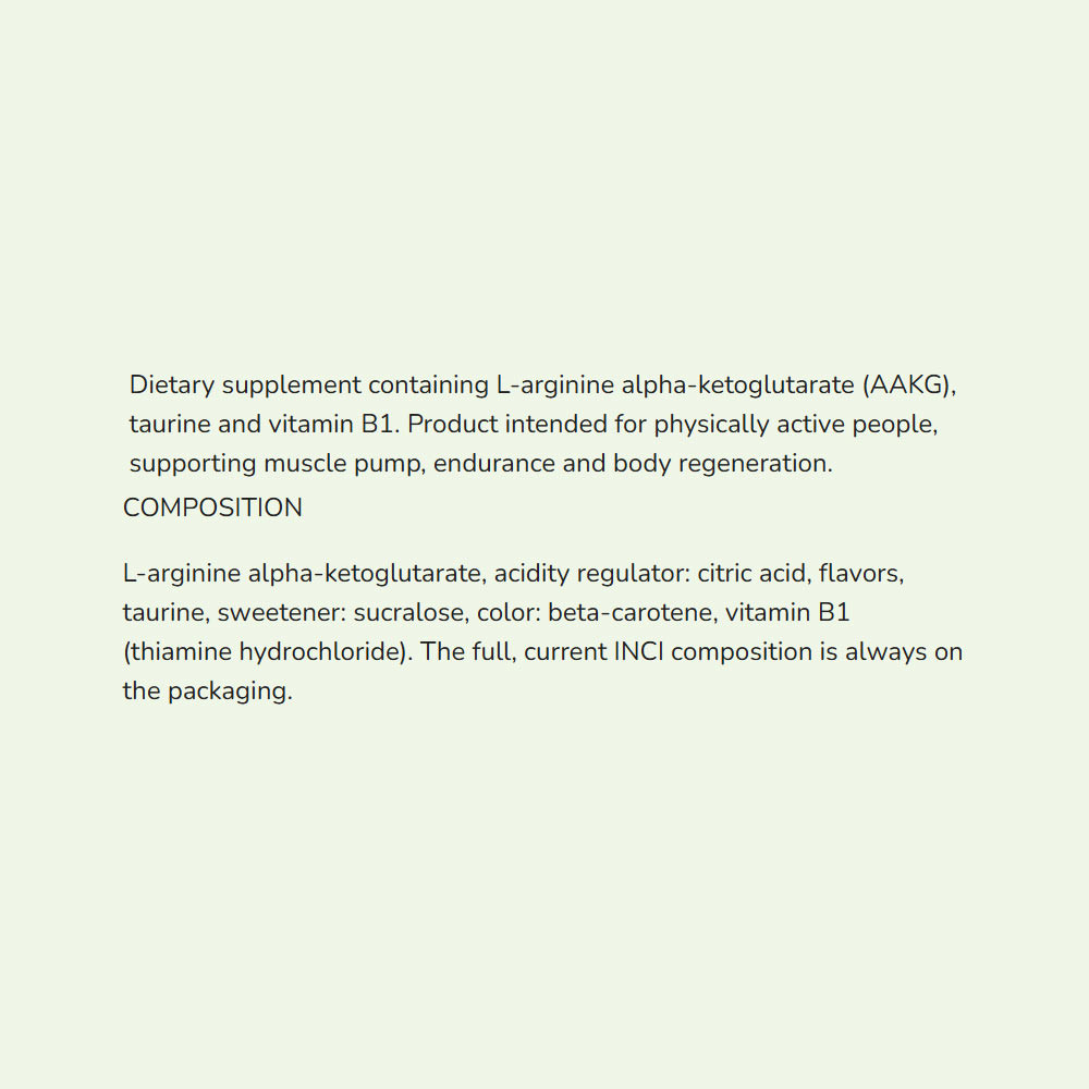 ALLNUTRITION AAKG MUSCLE PUMP is a modern formula containing the highest quality L-arginine alpha-ketoglutarate, taurine, and vitamin B1. Arginine participates in the synthesis of nitric oxide – this compound dilates blood vessels, ensuring proper oxygenation and nourishment of muscle tissue.