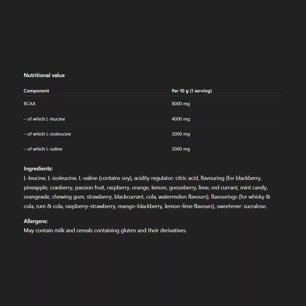 - BCAA amino acids powder - up to 8000 mg BCAA per portion