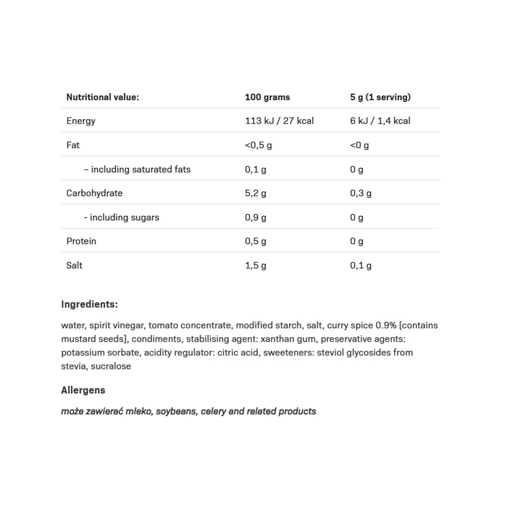 ALLNUTRITION CURRY SAUCE is a low-calorie sauce without fat or added sugar, with a delicious curry flavor. Chicken with rice again? Add this sauce and enjoy an exceptional, exotic taste! We guarantee it will be the perfect addition to your diet meals.