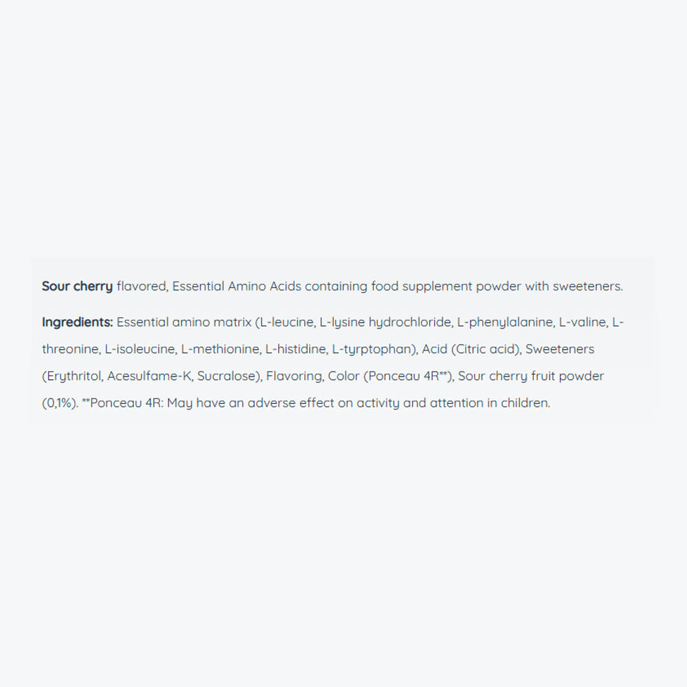 Sugar-free EAA drink powder with 1,733 mg BCAA and 4,314 mg essential amino acids per serving