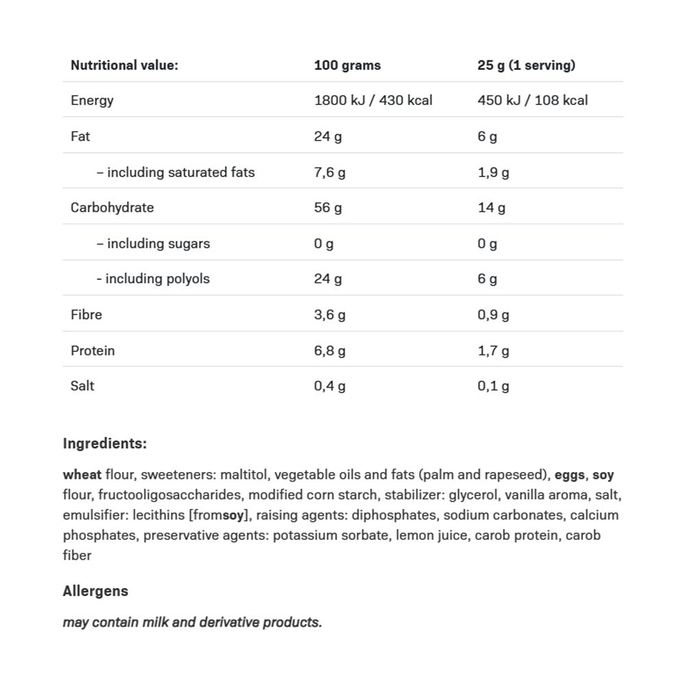 Sugar-free vanilla-flavoured wafer. Contains sweetener. Excessive consumption may cause a laxative effect. Do not consume if allergic (hypersensitive) to any of the ingredients. May contain milk products and milk derivatives.