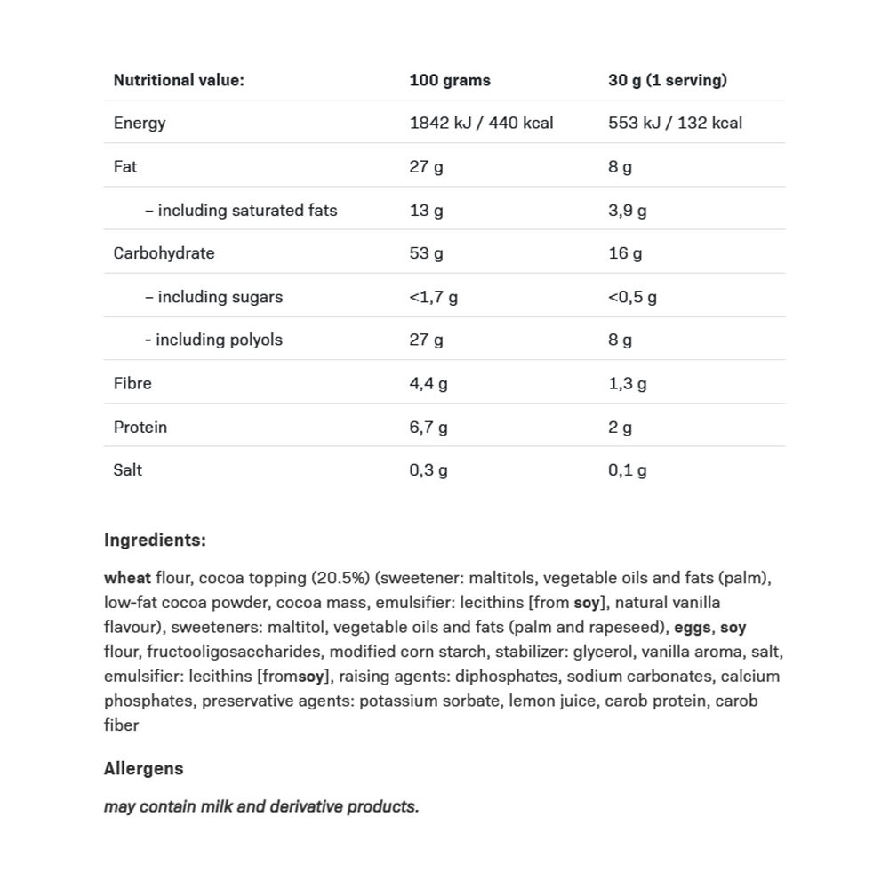 Vanilla-flavoured wafer with sugar-free cocoa coating. Contains sweetener. Excessive consumption may cause a laxative effect. Do not consume if allergic (hypersensitive) to any of the ingredients. Milk and milk-derived products may be present.