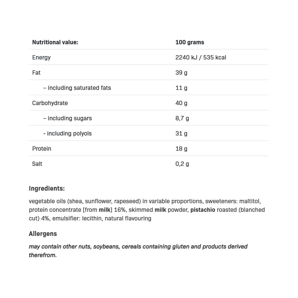 Pistachio-flavoured protein cream. Contains sweetener. No added sugar. Contains naturally occurring sugars. Source of protein. Do not consume if you are sensitive to any of the ingredients. Excessive consumption may have a laxative effect. Use as desired with meals, desserts, or as a spread. Stir before use. A balanced diet and a healthy lifestyle are recommended. May contain traces of other nuts, soy, cereals containing gluten, mustard, and their derivatives. Best before date / batch number: see lid. Store in a cool, dry, and airy place at room temperature. The colour or texture of the product may change during storage, but this does not affect its quality.