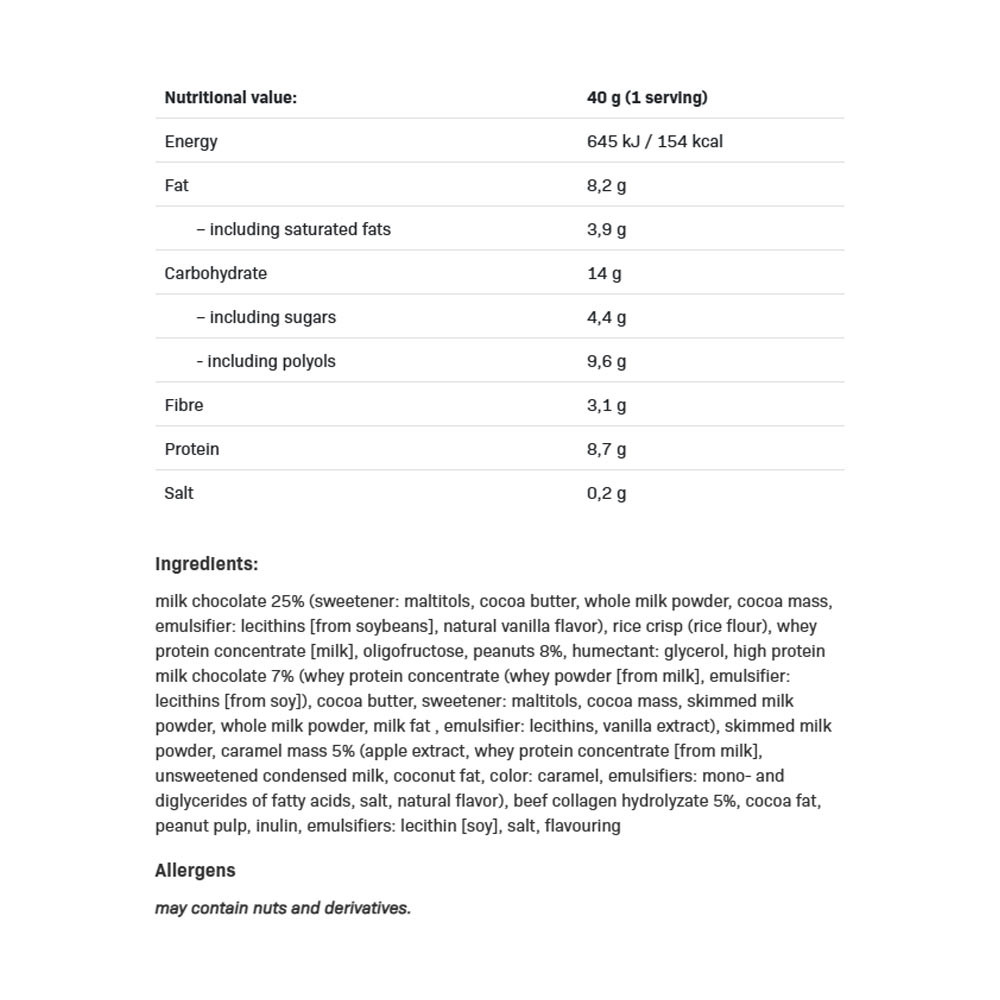 ALLNUTRITION FITKING PROTEIN SNACK BAR is a delicious, high-protein bar made from a carefully selected blend of ingredients. It’s packed with soft, velvety filling, coated in milk chocolate with crunchy nuts – all without added sugar!