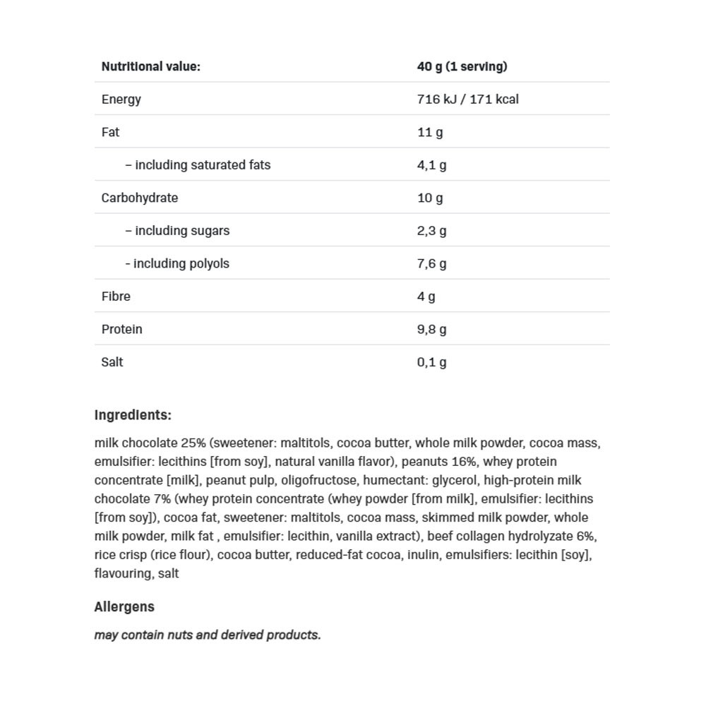 ALLNUTRITION FITKING PROTEIN SNACK BAR is a delicious, high-protein bar made from a carefully selected blend of ingredients. It’s packed with soft, velvety filling, coated in milk chocolate with crunchy nuts – all without added sugar!