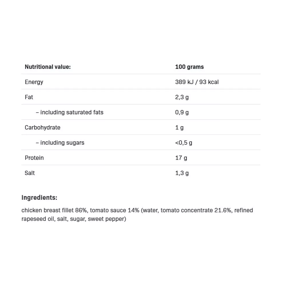 Ready-to-eat chicken breast in tomato sauce, with 17 g of protein per 100 g, minimal fat, and only 93 kcal