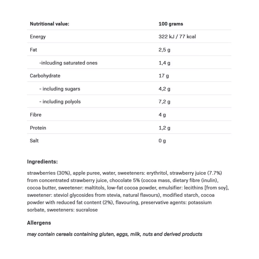 Contains sweetener. No added sugar. Contains naturally occurring sugars. Suitable for vegans. Do not use if you are allergic to any of the ingredients. May contain fruit stalks. Darkening of the product during storage is a natural process. A balanced diet and a healthy lifestyle are recommended. May contain cereals containing gluten, eggs, milk, nuts and products derived from them.