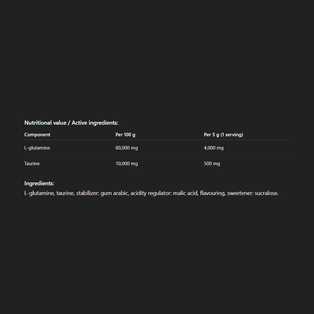 Supports muscle recovery post-workout with a high dose of L-glutamine and taurine for active athletes