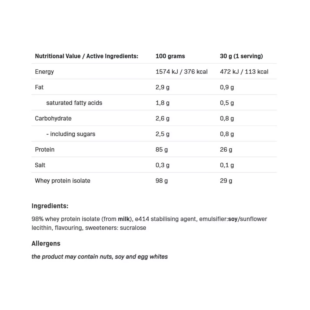 SUPPORT IN BUILDING MUSCLE MASS ISOLATE PROTEIN is intended to supplement the body's protein requirements. Due to the limited amount of additional ingredients, the supplement provides a large portion of pure whey protein.