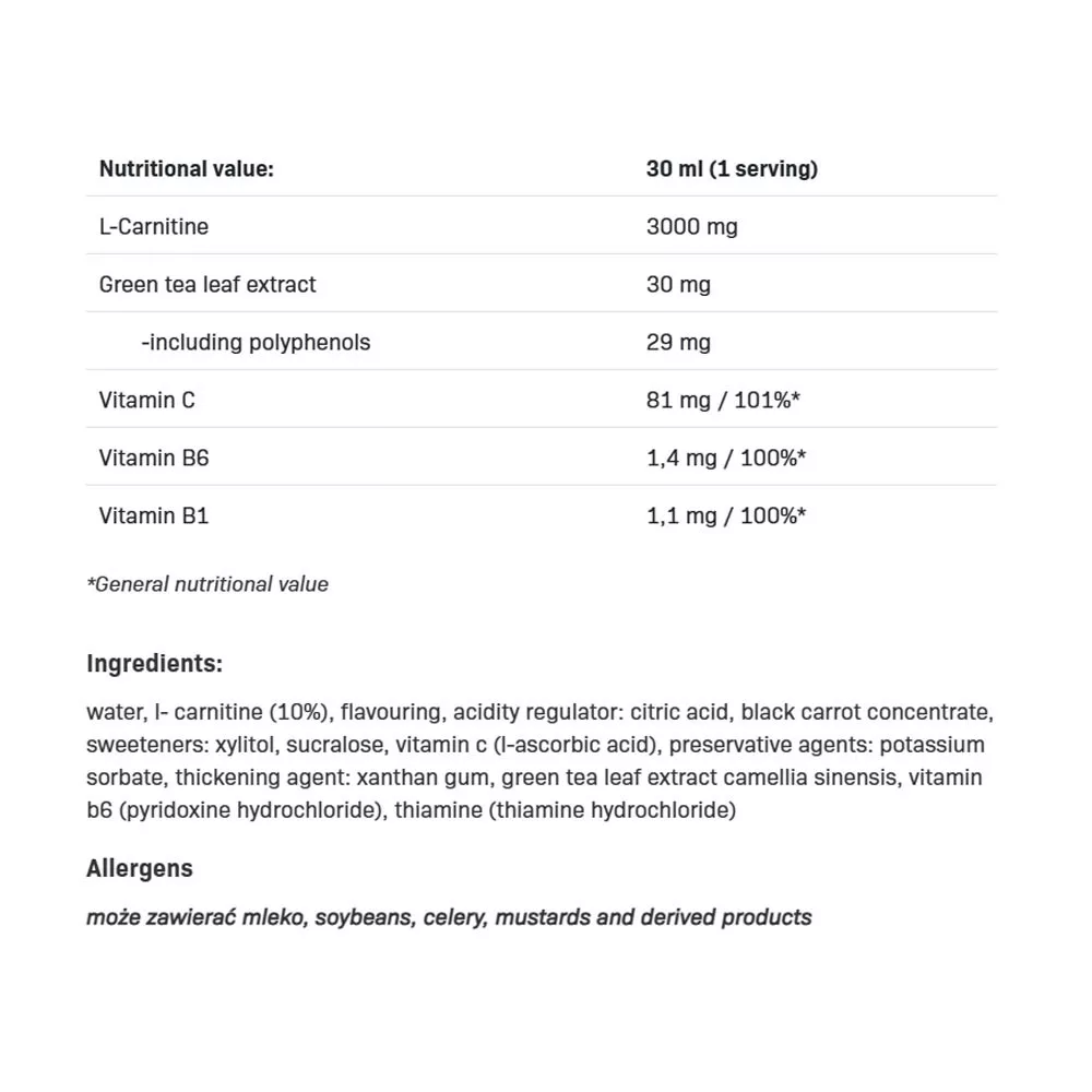 ALLNUTRITION - L-CARNI is an orange-flavored liquid dietary supplement with green tea extract and vitamins. Vitamin B6 and thiamine contribute to the proper maintenance of energy-yielding metabolic processes.