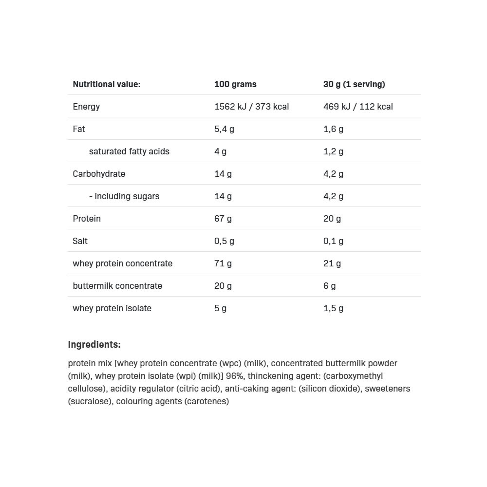 Do not consume if allergic to any ingredient. May contain soy. Not suitable for pregnant or breastfeeding women. A balanced diet and healthy lifestyle are recommended. This supplement should not replace a varied diet and is intended primarily for active individuals. Do not exceed the recommended daily intake. Always reseal after opening. Nutritional values may vary slightly by flavor. Protein content is given on a dry matter basis.