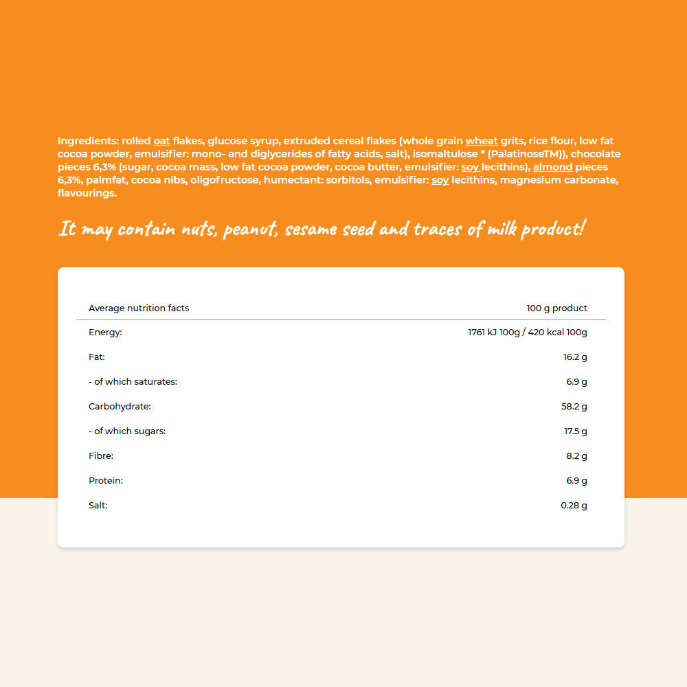 Ingredients: rolled oat flakes, glucose syrup, extruded cereal flakes (whole grain wheat grits, rice flour, low fat cocoa powder, emulsifier: mono- and diglycerides of fatty acids, salt), isomaltulose * (PalatinoseTM)), chocolate pieces 6,3% (sugar, cocoa mass, low fat cocoa powder, cocoa butter, emulsifier: soy lecithins), almond pieces 6,3%, palmfat, cocoa nibs, oligofructose, humectant: sorbitols, emulsifier: soy lecithins, magnesium carbonate, flavourings.