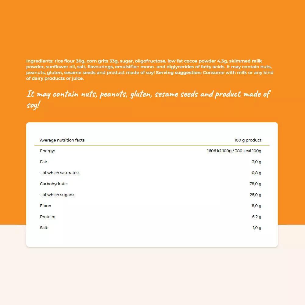 Ingredients: rice flour 36g, corn grits 33g, sugar, oligofructose, low fat cocoa powder 4,3g, skimmed milk powder, sunflower oil, salt, flavourings, emulsifier: mono- and diglycerides of fatty acids. It may contain nuts, peanuts, gluten, sesame seeds and product made of soy! Serving suggestion: Consume with milk or any kind of dairy products or juice.