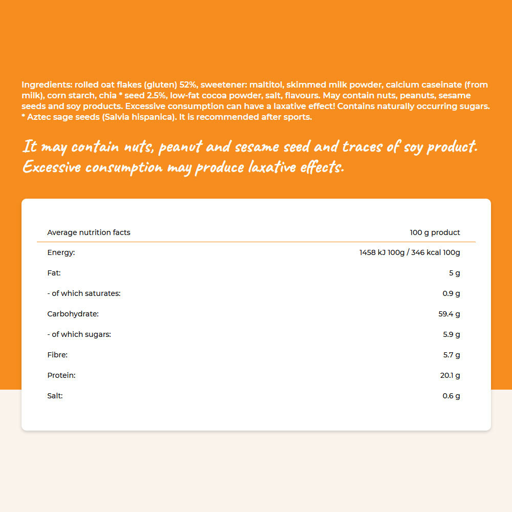 Ingredients: rolled oat flakes (gluten) 52%, sweetener: maltitol, skimmed milk powder, calcium caseinate (from milk), corn starch, chia * seed 2.5%, low-fat cocoa powder, salt, flavours. May contain nuts, peanuts, sesame seeds and soy products. Excessive consumption can have a laxative effect! Contains naturally occurring sugars. * Aztec sage seeds (Salvia hispanica). It is recommended after sports.