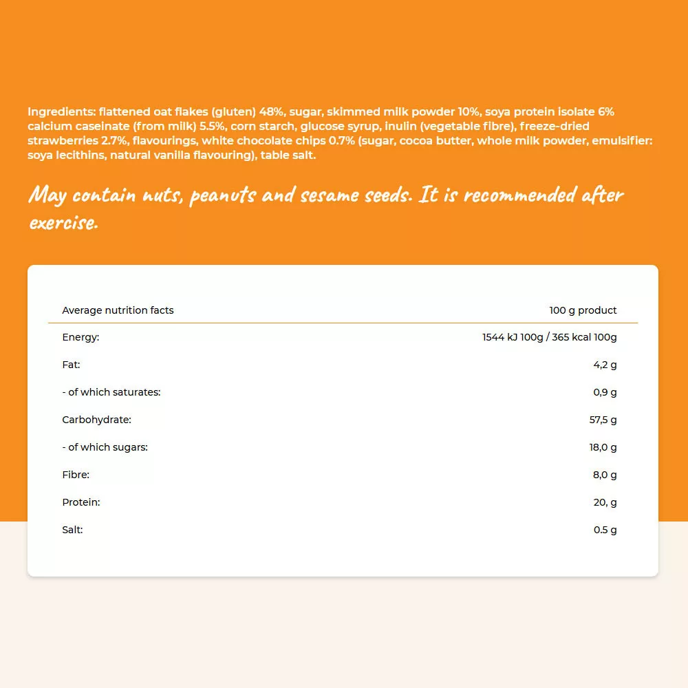 Ingredients: flattened oat flakes (gluten) 48%, sugar, skimmed milk powder 10%, soya protein isolate 6% calcium caseinate (from milk) 5.5%, corn starch, glucose syrup, inulin (vegetable fibre), freeze-dried strawberries 2.7%, flavourings, white chocolate chips 0.7% (sugar, cocoa butter, whole milk powder, emulsifier: soya lecithins, natural vanilla flavouring), table salt.