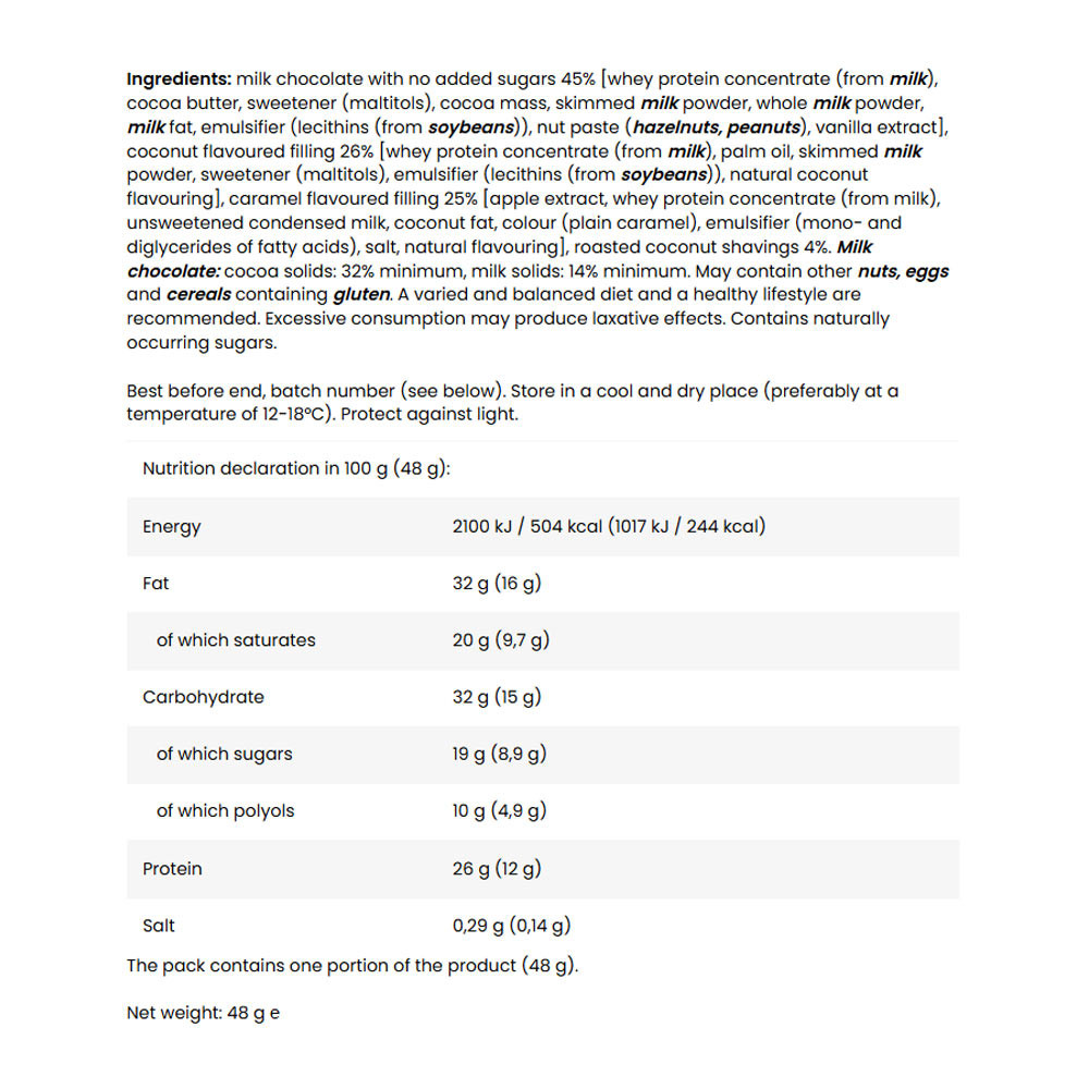 Ingredients: milk chocolate with no added sugars 45% [whey protein concentrate (from milk), cocoa butter, sweetener (maltitols), cocoa mass, skimmed milk powder, whole milk powder, milk fat, emulsifier (lecithins (from soybeans)), nut paste (hazelnuts, peanuts), vanilla extract], coconut flavoured filling 26% [whey protein concentrate (from milk), palm oil, skimmed milk powder, sweetener (maltitols), emulsifier (lecithins (from soybeans)), natural coconut flavouring], caramel flavoured filling 25% [apple extract, whey protein concentrate (from milk), unsweetened condensed milk, coconut fat, colour (plain caramel), emulsifier (mono- and diglycerides of fatty acids), salt, natural flavouring], roasted coconut shavings 4%. Milk chocolate: cocoa solids: 32% minimum, milk solids: 14% minimum. May contain other nuts, eggs and cereals containing gluten. A varied and balanced diet and a healthy lifestyle are recommended. Excessive consumption may produce laxative effects. Contains naturally occurring sugars.