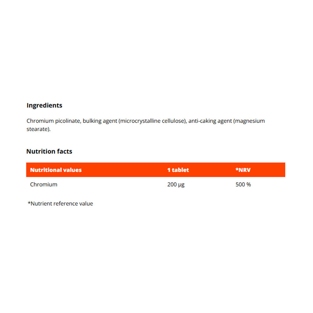 Chromium Picolinate is a functional dietary supplement that contains the mineral chromium. This mineral contributes to maintaining normal blood glucose levels, making it an ideal choice for anyone who wants to take good care of their health in this regard. Moreover, it also helps with the optimal metabolism of macronutrients. Chromium is naturally found in the food you eat, for example, in grains, fruits, and vegetables. However, you can also use dietary supplements to easily meet your daily recommended intake of chromium. This product contains chromium bound to picolinic acid, which is a functional form that can help you optimize the way you take care of your health.