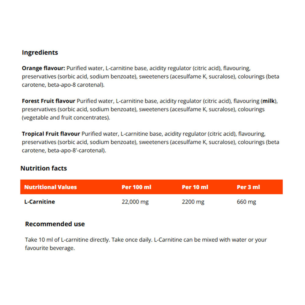 Take 10 ml of L-carnitine directly. Take once daily. L-Carnitine can be mixed with water or your favourite beverage.