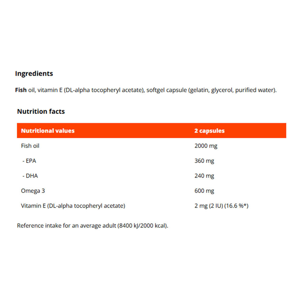 In each serving, you will thus take in 2000 mg of fish oil, of which 600 mg of omega 3 fatty acids. For a comprehensive effect, the formula is also enriched with vitamin E, which helps protect cells from oxidative stress. Thanks to the form of practical capsules, this product is also easy to take. The Omega 3 supplement thus offers a convenient solution to add healthy fats containing EPA and DHA, as well as vitamin E to a balanced diet.
