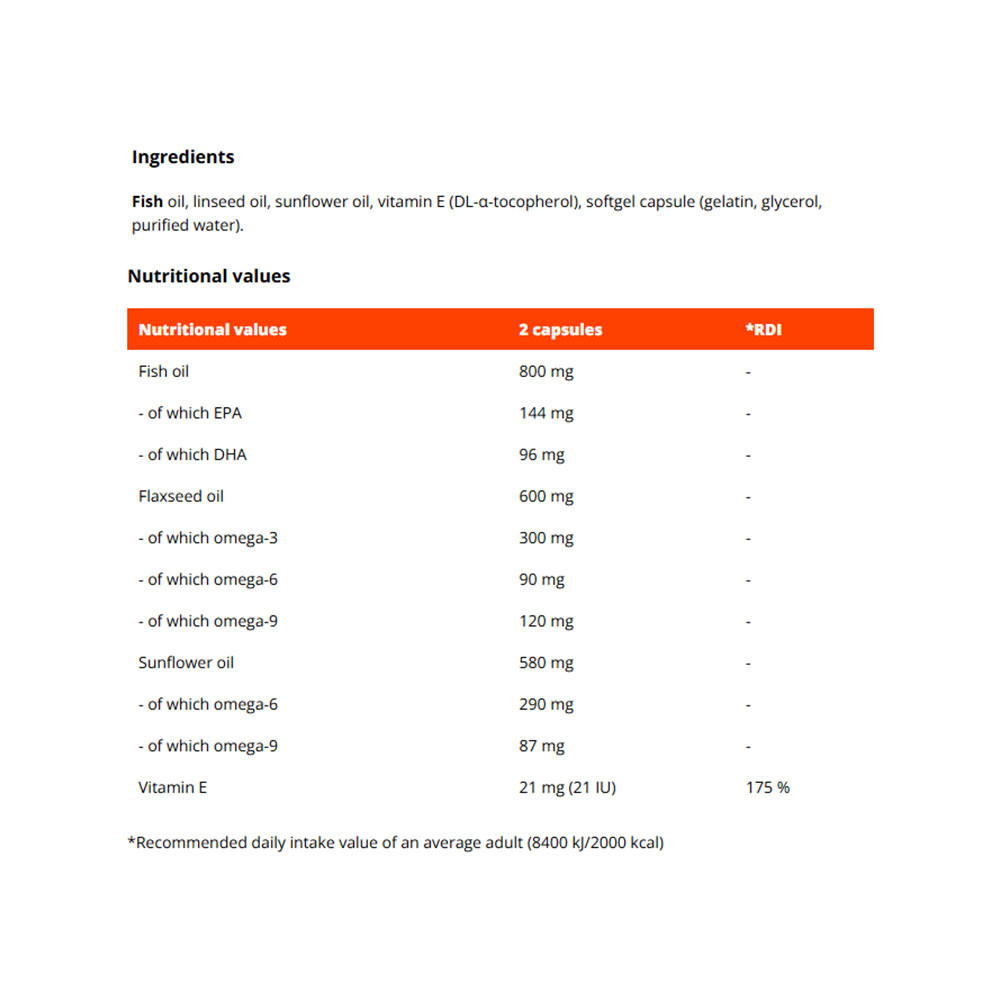 Each serving (2 capsules) contains 800 mg of fish oil, which contains 144 mg of eicosapentaenoic acid (EPA) and 96 mg of docosahexaenoic acid (DHA). Together, they support normal heart function at a daily intake of 250 mg. In addition, linseed and sunflower oil contain a wide range of fatty acids. It also includes vitamin E, which contributes to the protection of cells from oxidative stress.