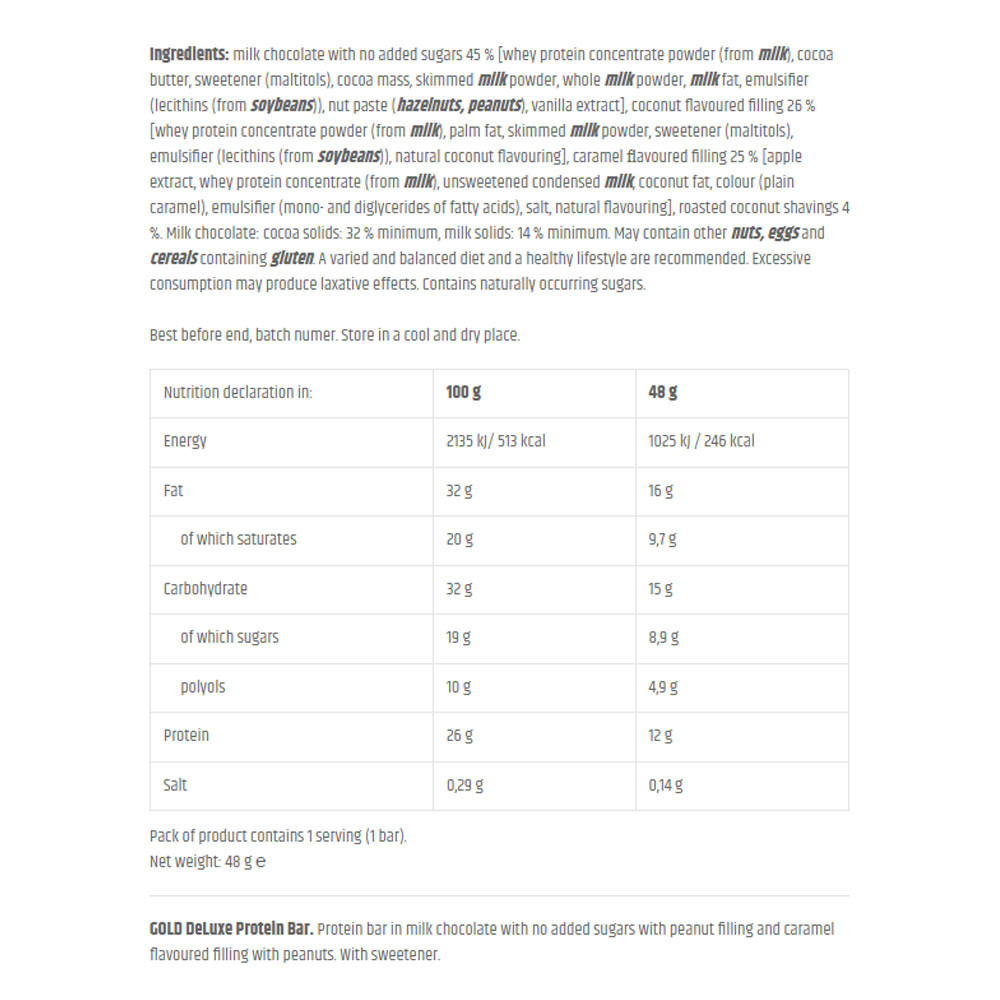 Ingredients: milk chocolate with no added sugars 45 % [whey protein concentrate powder (from milk), cocoa butter, sweetener (maltitols), cocoa mass, skimmed milk powder, whole milk powder, milk fat, emulsifier (lecithins (from soybeans)), nut paste (hazelnuts, peanuts), vanilla extract], coconut flavoured filling 26 % [whey protein concentrate powder (from milk), palm fat, skimmed milk powder, sweetener (maltitols), emulsifier (lecithins (from soybeans)), natural coconut flavouring], caramel flavoured filling 25 % [apple extract, whey protein concentrate (from milk), unsweetened condensed milk, coconut fat, colour (plain caramel), emulsifier (mono- and diglycerides of fatty acids), salt, natural flavouring], roasted coconut shavings 4 %. Milk chocolate: cocoa solids: 32 % minimum, milk solids: 14 % minimum. May contain other nuts, eggs and cereals containing gluten. A varied and balanced diet and a healthy lifestyle are recommended. Excessive consumption may produce laxative effects. Contains naturally occurring sugars.DIRECTION (1 serving = 48 g)