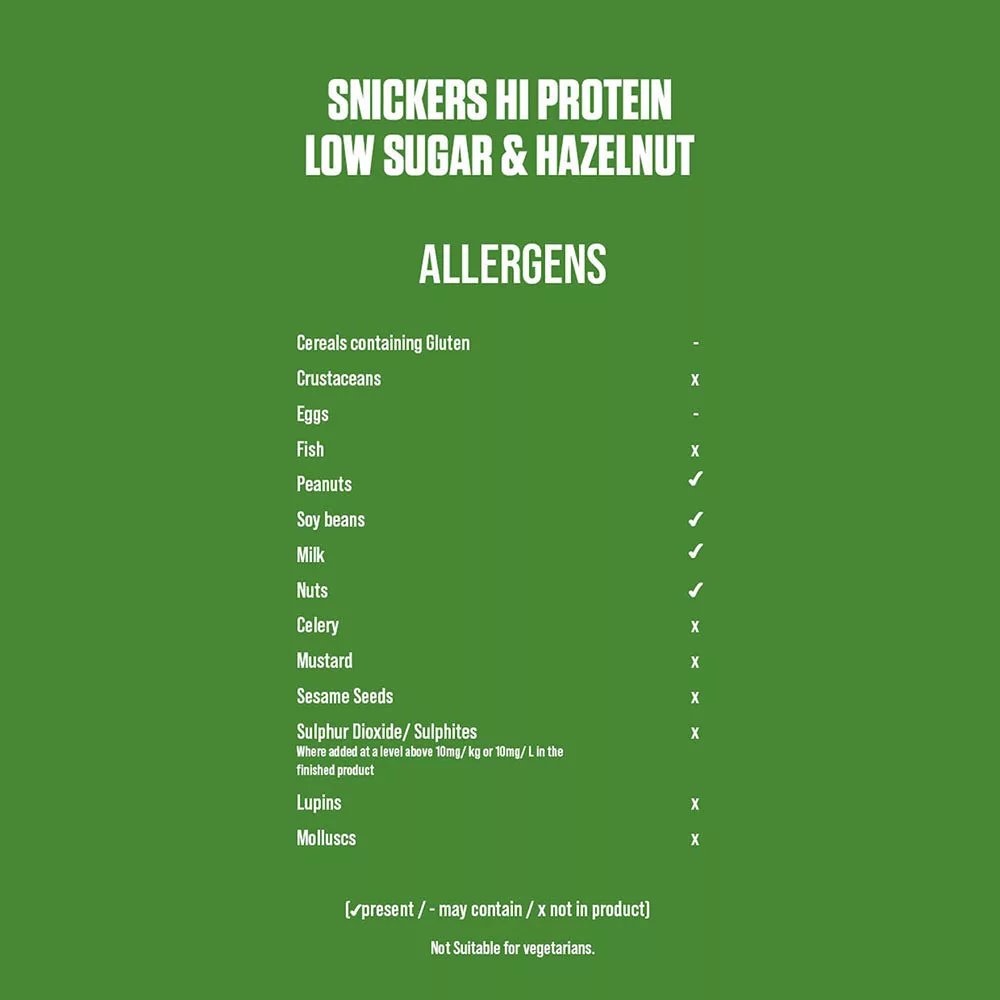 Made with hearty hazelnuts, this special edition Snickers Protein Low Sugar Bar bar is crammed full of delicious crunchy hazelnuts, gooey hazelnut paste, chewy caramel and is finished in smooth milk chocolate coating.