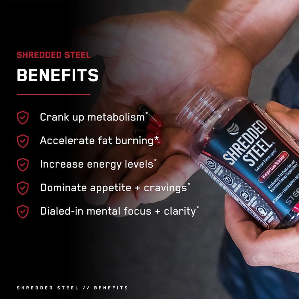 Each serving of Shredded Steel® delivers a precise combination of six research-backed, patented ingredients, along with other all-natural compounds, which are known to accelerate fat burning, boost metabolism, increase energy levels, enhance mental focus and clarity, and suppress appetite.