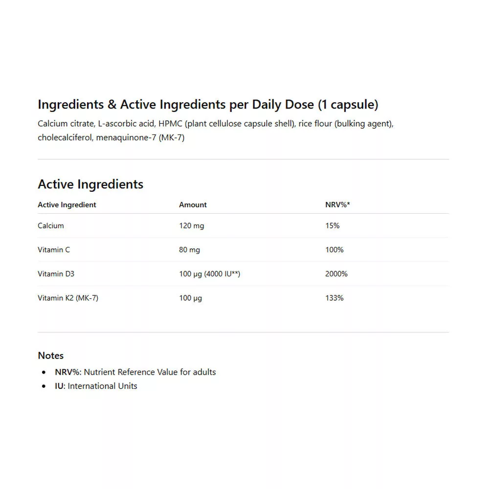 Bone health is not determined by a single nutrient. Proper absorption, utilization, and incorporation of calcium require the coordinated presence of multiple micronutrients. Vitamin D supports the normal absorption of calcium and phosphorus, vitamin K2 contributes to the maintenance of normal bones, while calcium is a fundamental building block of bones and teeth.