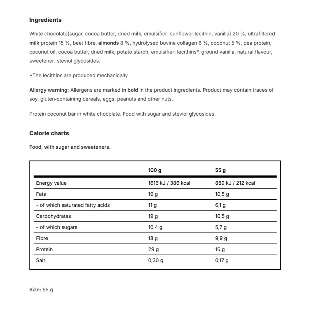 The bar is coated with the highest quality white chocolate. The chocolate has a high cocoa content and contains natural vanilla extract. It is sweetened with a low-calorie stevia-based sweetener and a hint of sugar.
