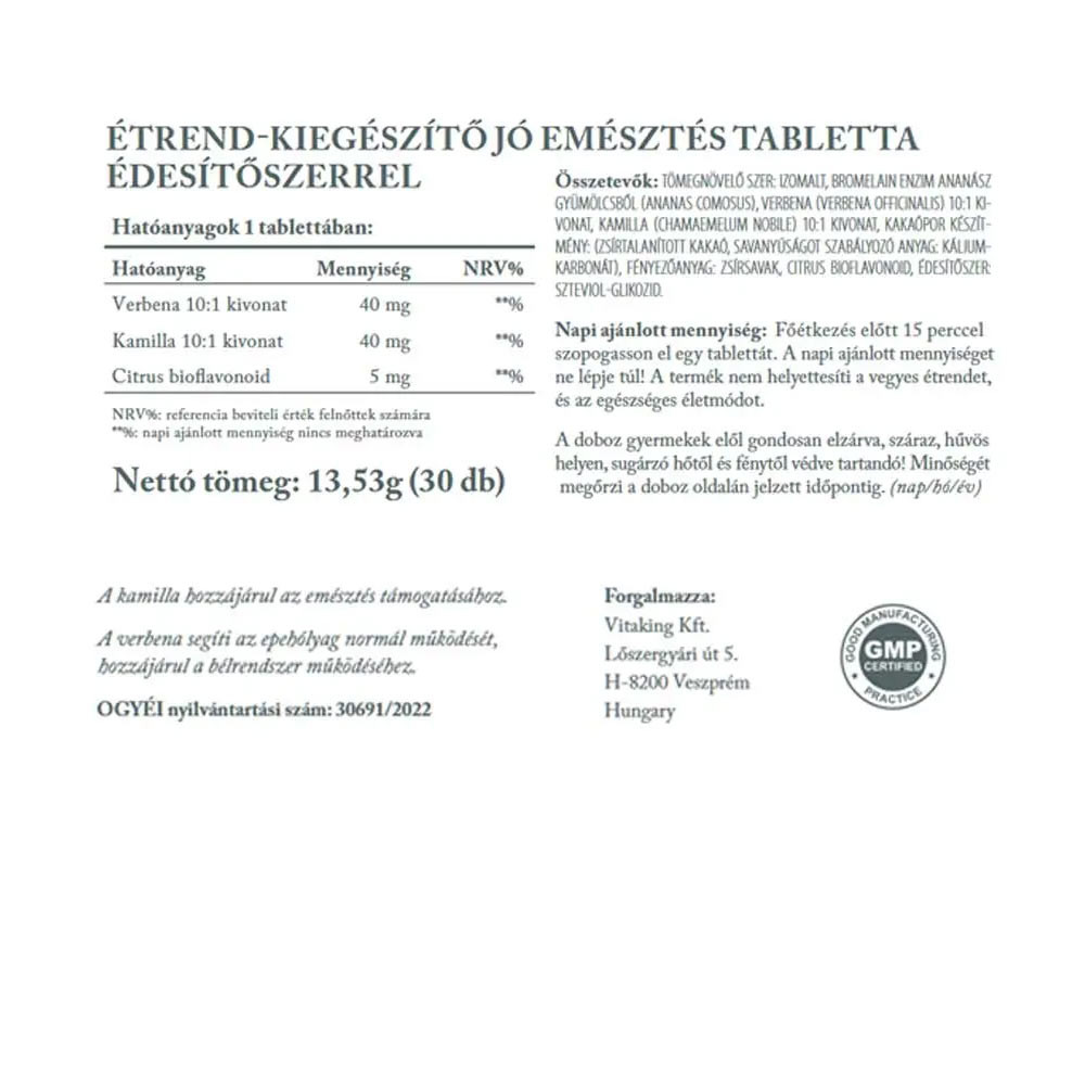 Vitaking Good Digestion Sucking Tablets are a dietary supplement. It is not a medicine. However, unlike a classic dietary supplement such as a multivitamin, it does not have to be taken for life. Experience has shown that after 2-3 months of use, it becomes unnecessary, as bile production normalises and digestion will work well on its own for a long time.
