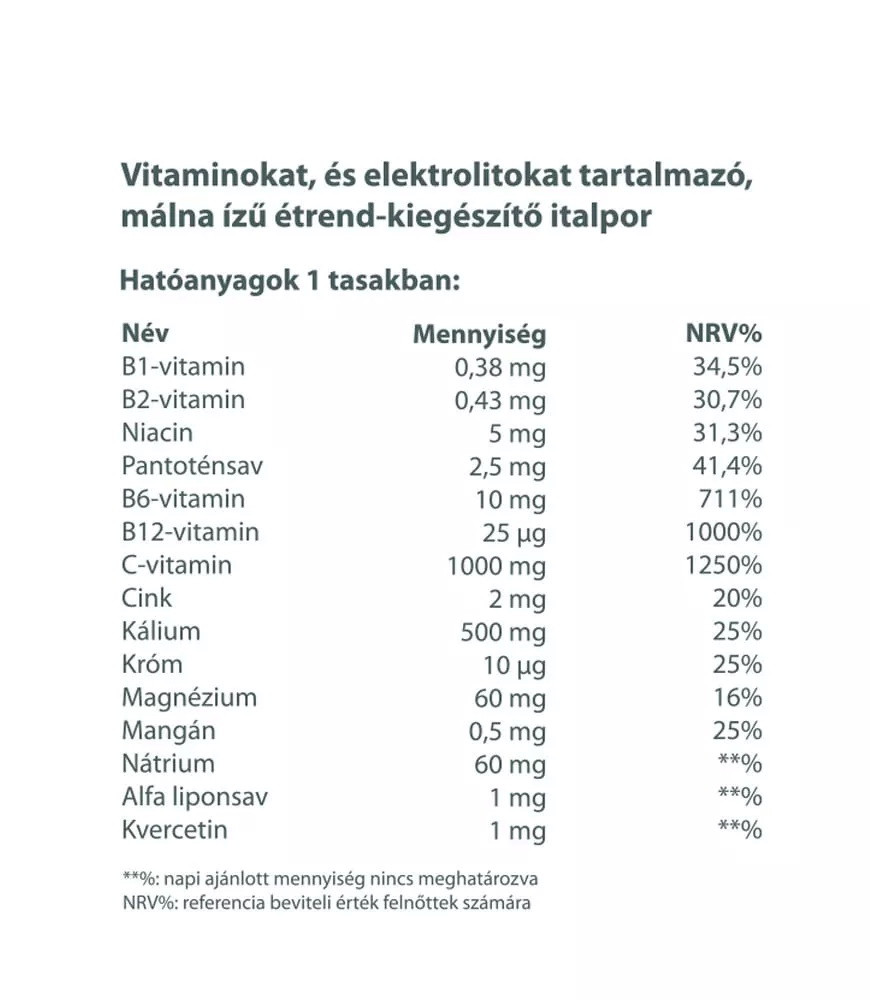 A pleasant-tasting raspberry multivitamin drink powder with 1000 mg of vitamin C, B vitamins and a significant amount of valuable minerals.