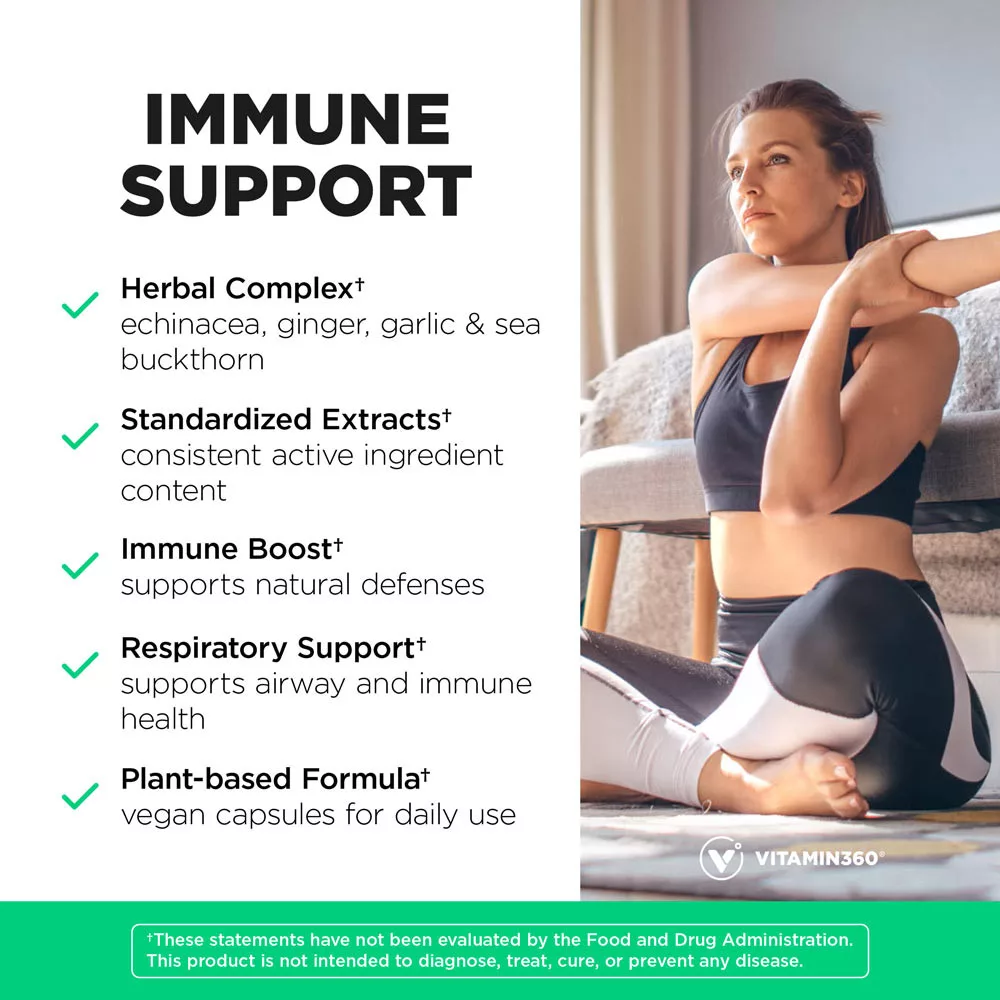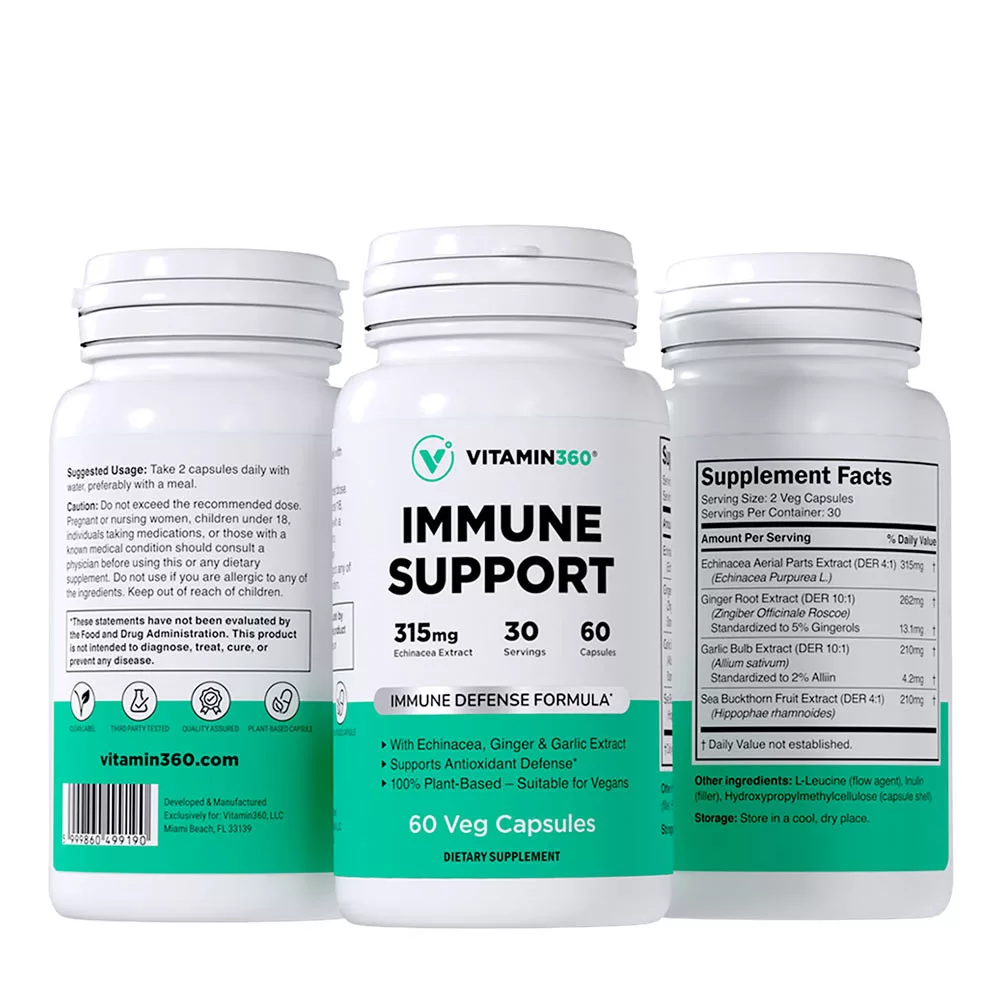 The Vitamin360 Immune Support contains echinacea, ginger, garlic and sea buckthorn – all in standardized, concentrated extract form and in high doses.